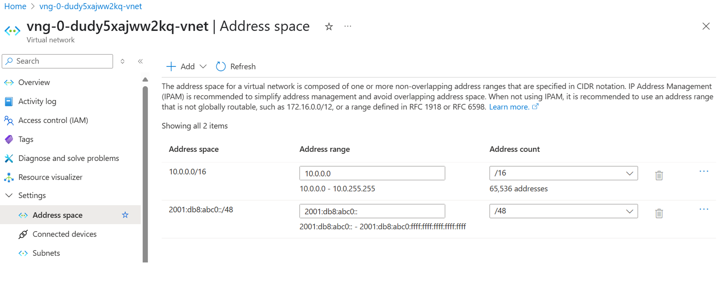 Maak een virtueel netwerk met IPv4- en IPv6-adresbereiken.