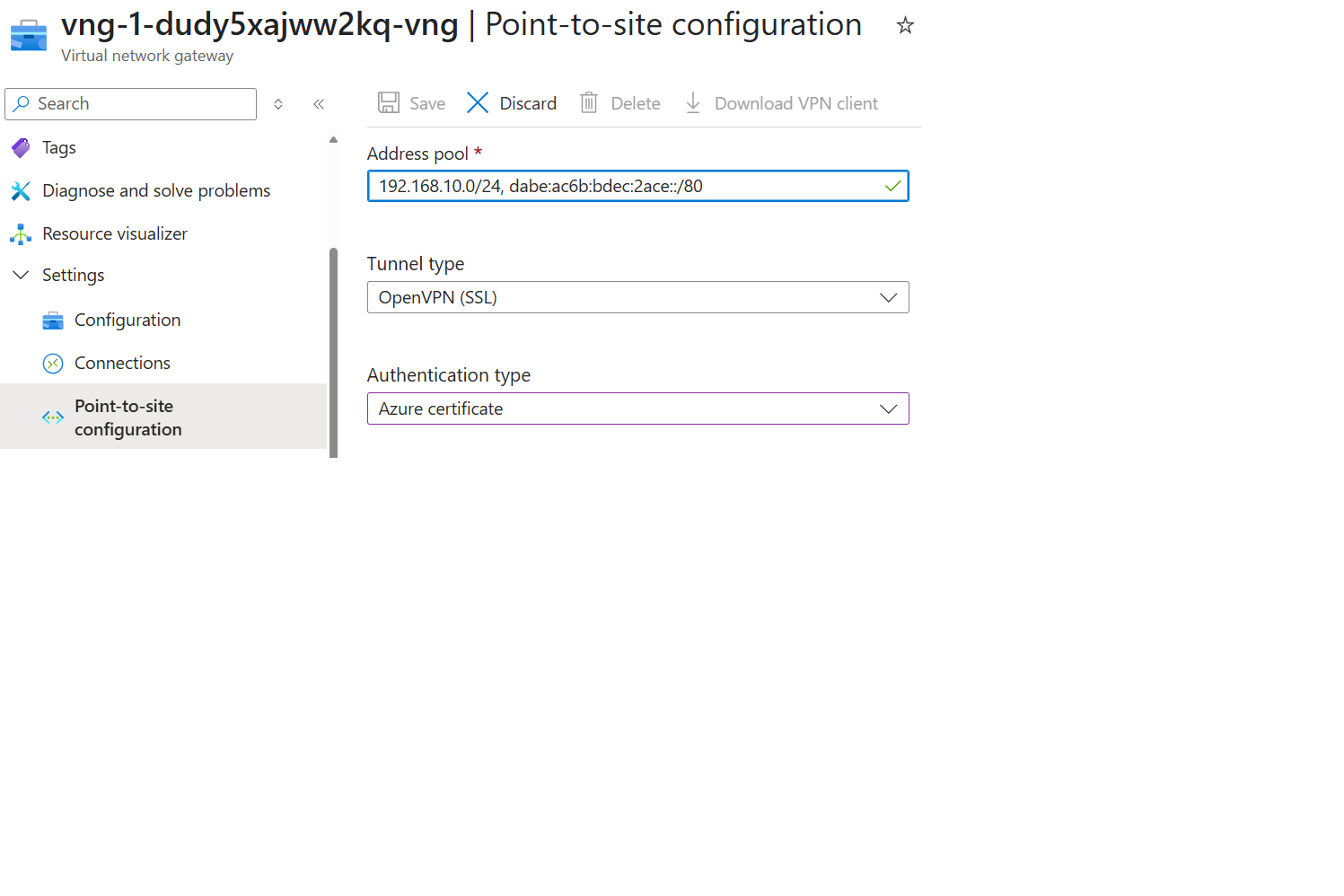 - Punt-naar-site-VPN-gateways met behulp van IKEv2- en OpenVPN-protocollen ondersteunen IPv6. Punt-naar-site-VPN-gateways bieden geen ondersteuning voor IPv6 bij het gebruik van het SSTP-protocol.