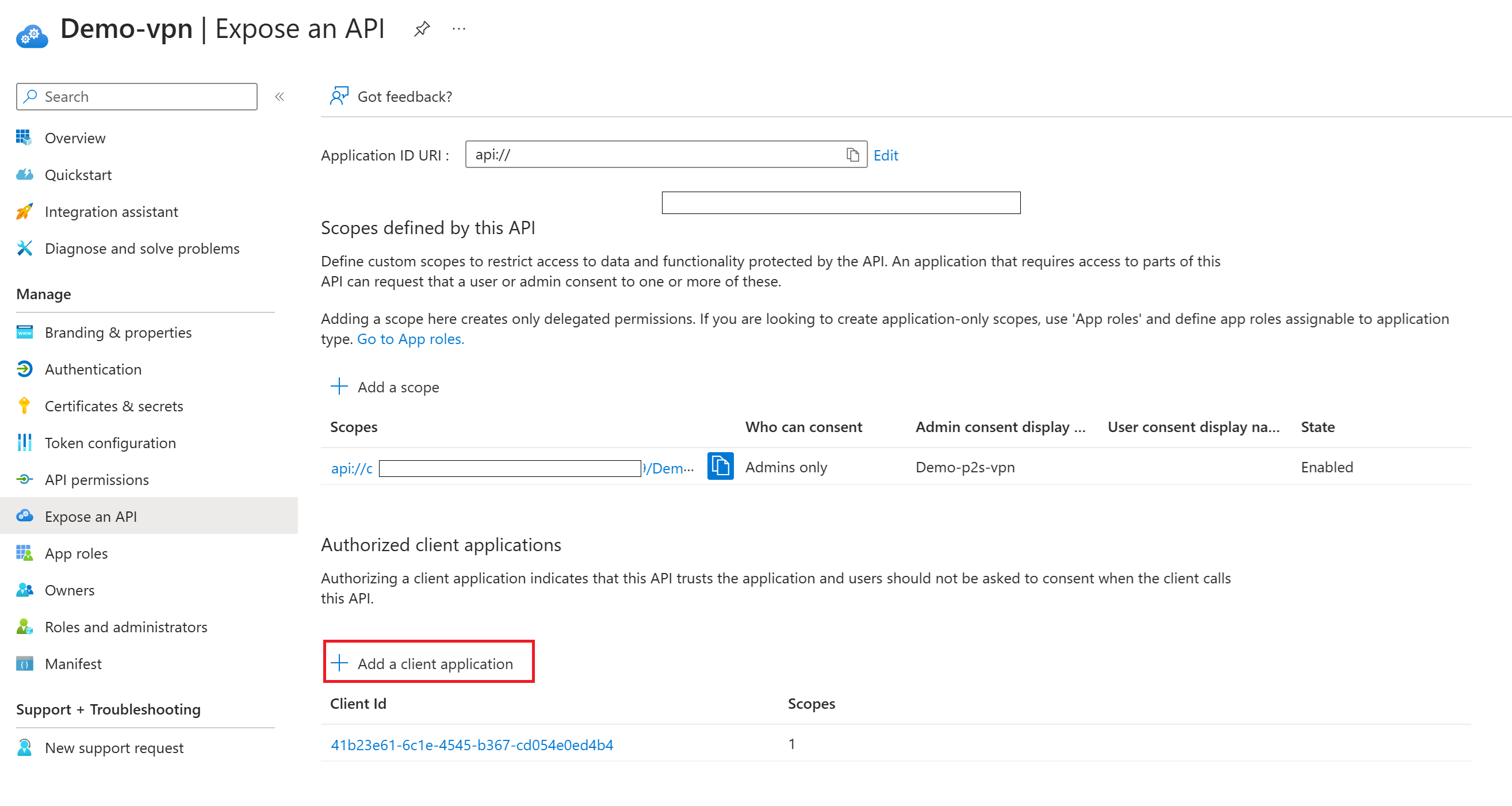 Client Idvan de Azure VPN-client aanwezig is.Selecteer + Een clienttoepassing toevoegen.