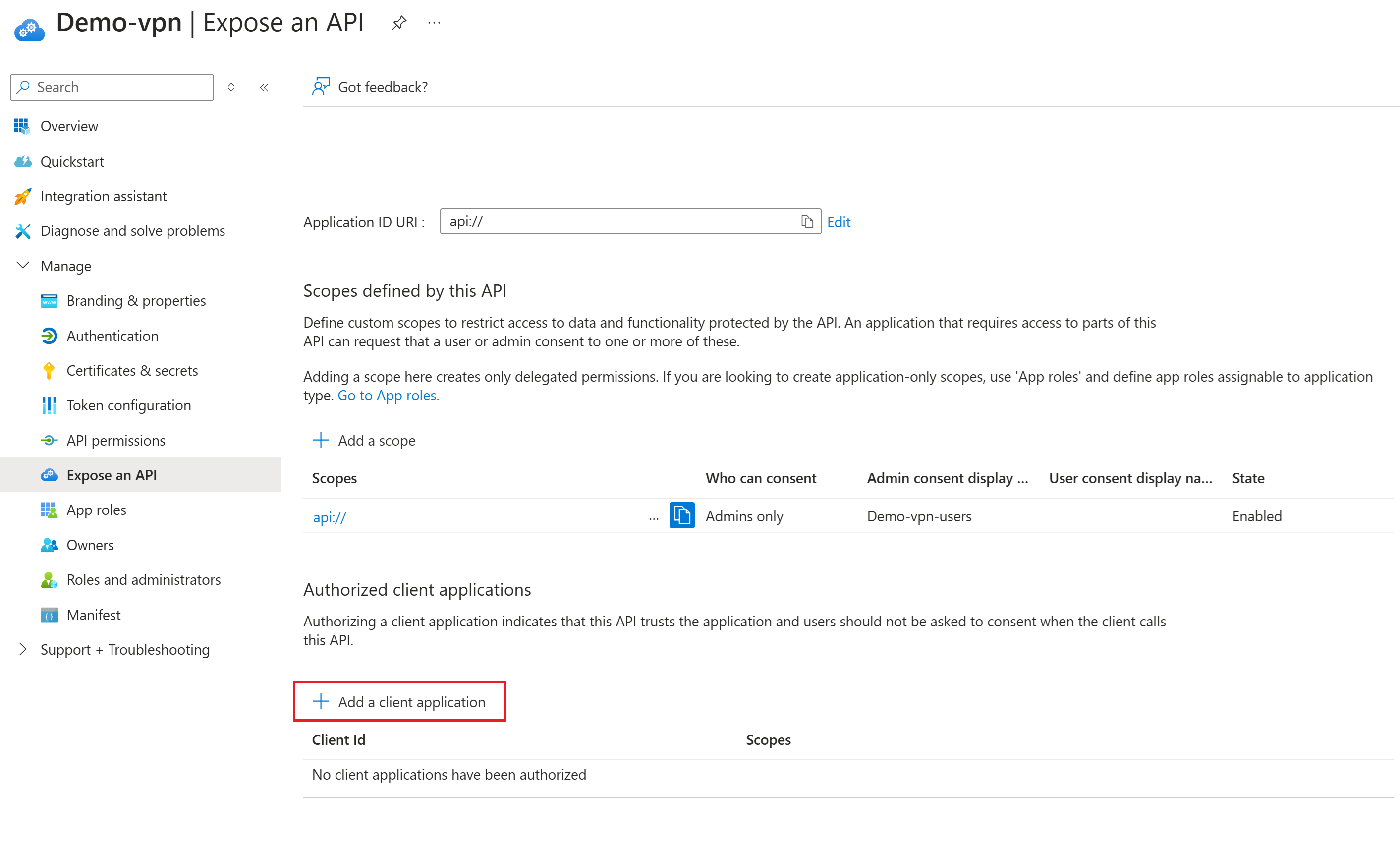 In de volgende stappen voegt u een andere geautoriseerde clienttoepassing toe met behulp van de app-id-doelgroepwaarde van de Microsoft-geregistreerde Azure VPN-client. U wijzigt de waarde van de bestaande geautoriseerde clienttoepassing niet. U kunt de bestaande geautoriseerde clienttoepassing altijd verwijderen als u deze niet meer gebruikt.