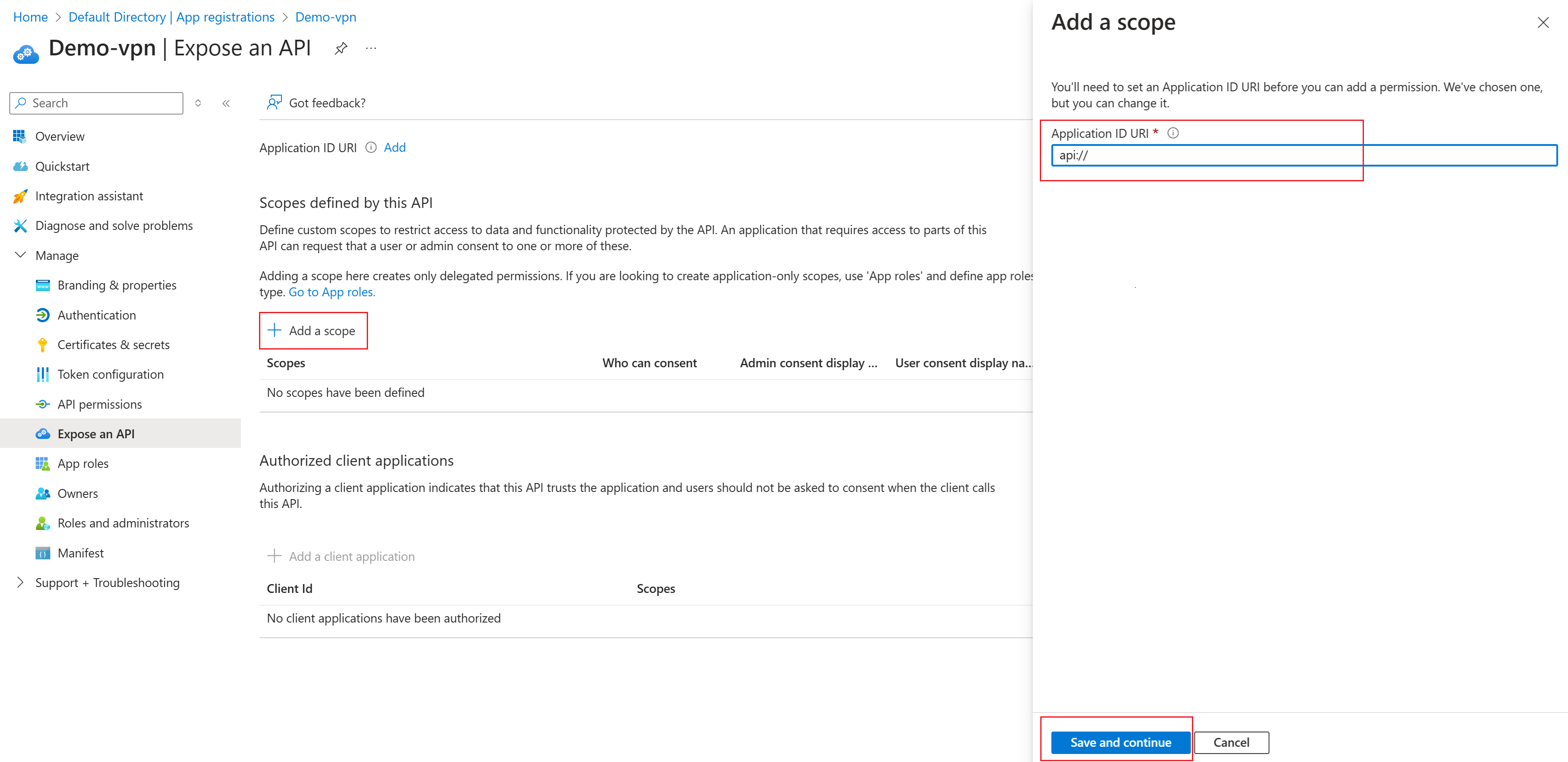 api://<application-client-id>. De "App ID URI" fungeert als het voorvoegsel voor de scopes waarnaar u verwijst in de code van uw API, en moet wereldwijd uniek zijn.Selecteer Opslaan en ga door naar het volgende deelvenster Een bereik toevoegen.