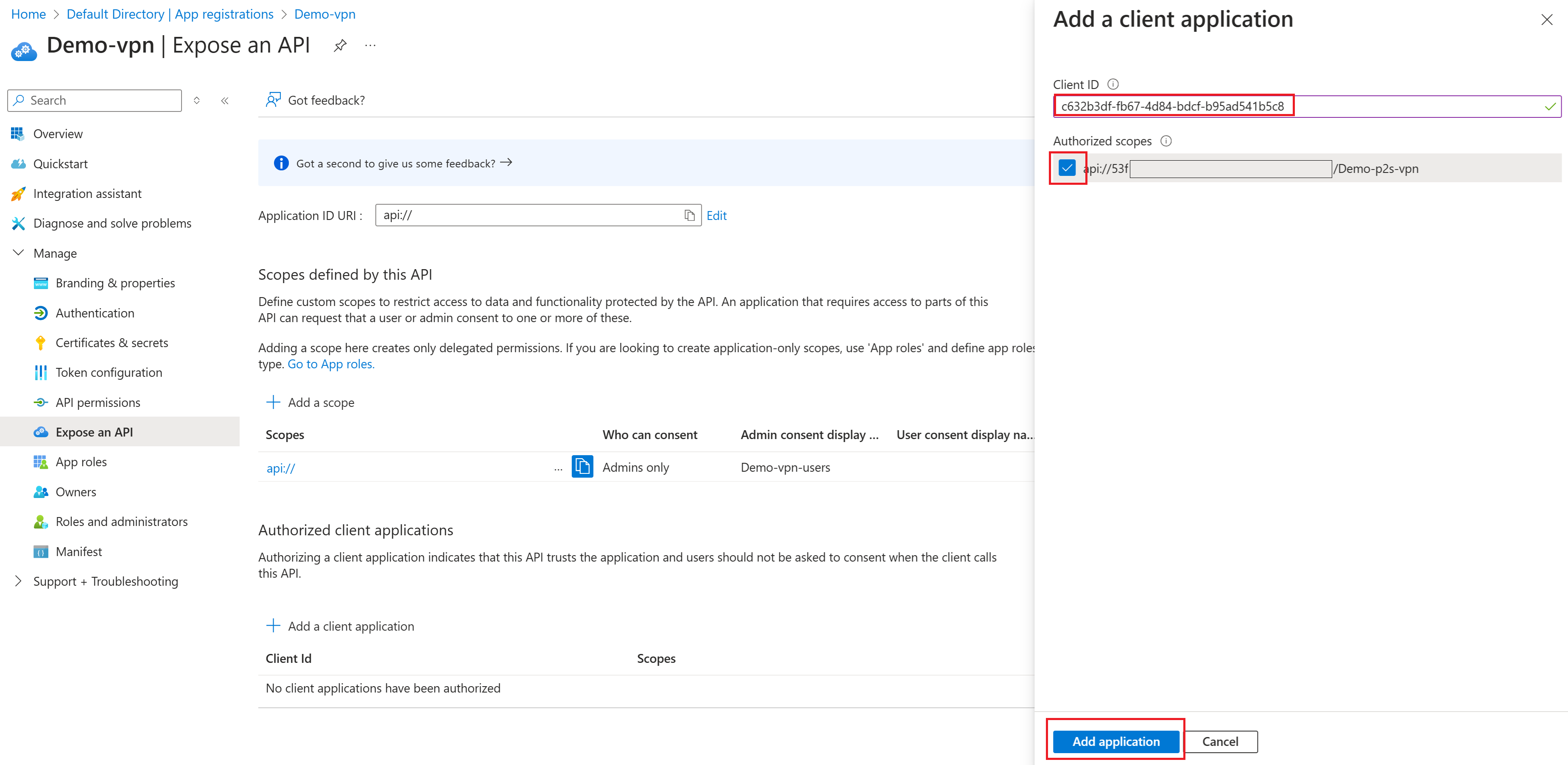 Gebruik in het deelvenster Een clienttoepassing toevoegen voor client-id de toepassings-id voor de door Microsoft geregistreerde Azure VPN Client-app.