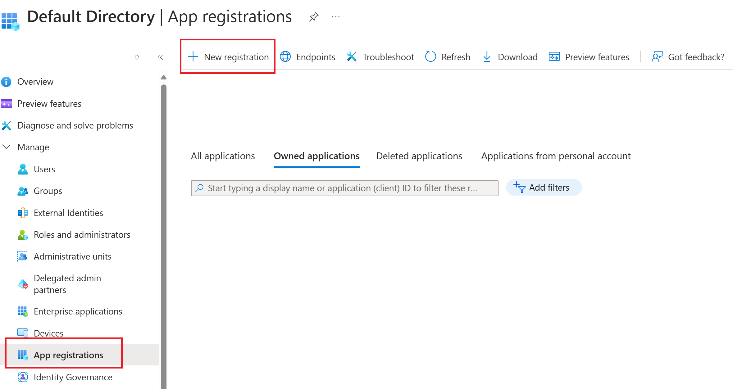 Er zijn verschillende manieren om naar de App-registraties pagina te gaan. Een manier is via het Microsoft Entra-beheercentrum. U kunt ook de Azure-portal en De Microsoft Entra-id gebruiken. Meld u aan met een account met de rol Cloudtoepassingsbeheerder of hoger.