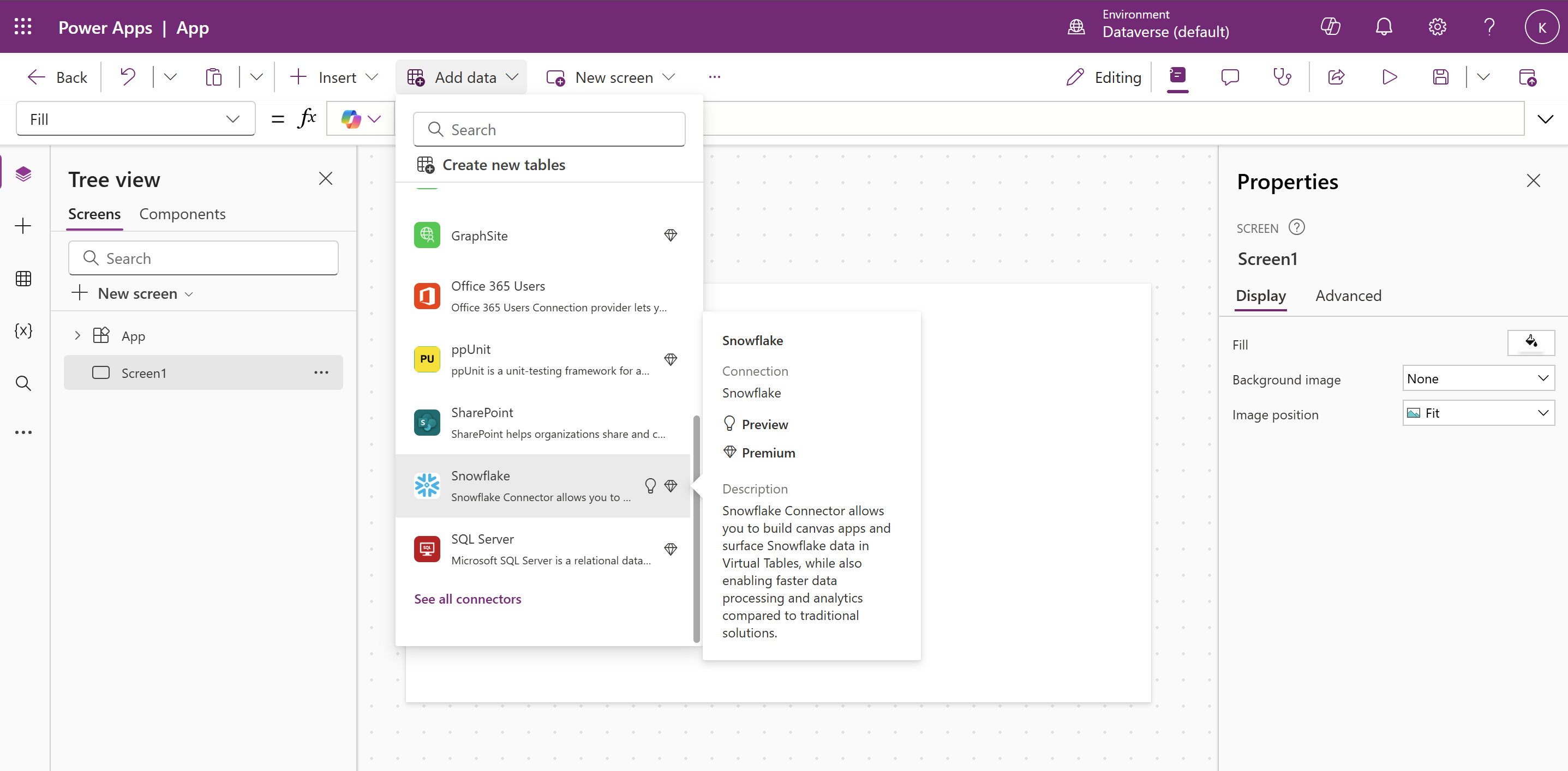 - Gebruikers moeten eerst virtuele tabellen maken en deze vervolgens laden in apps met de Snowflake-verbinding (een verbinding die alleen wordt gemaakt met service-principal-verificatie). Meer informatie over het maken van virtuele tabellen: virtuele tabellen maken en bewerken met Microsoft Dataverse - Power Apps | Microsoft Learn.
