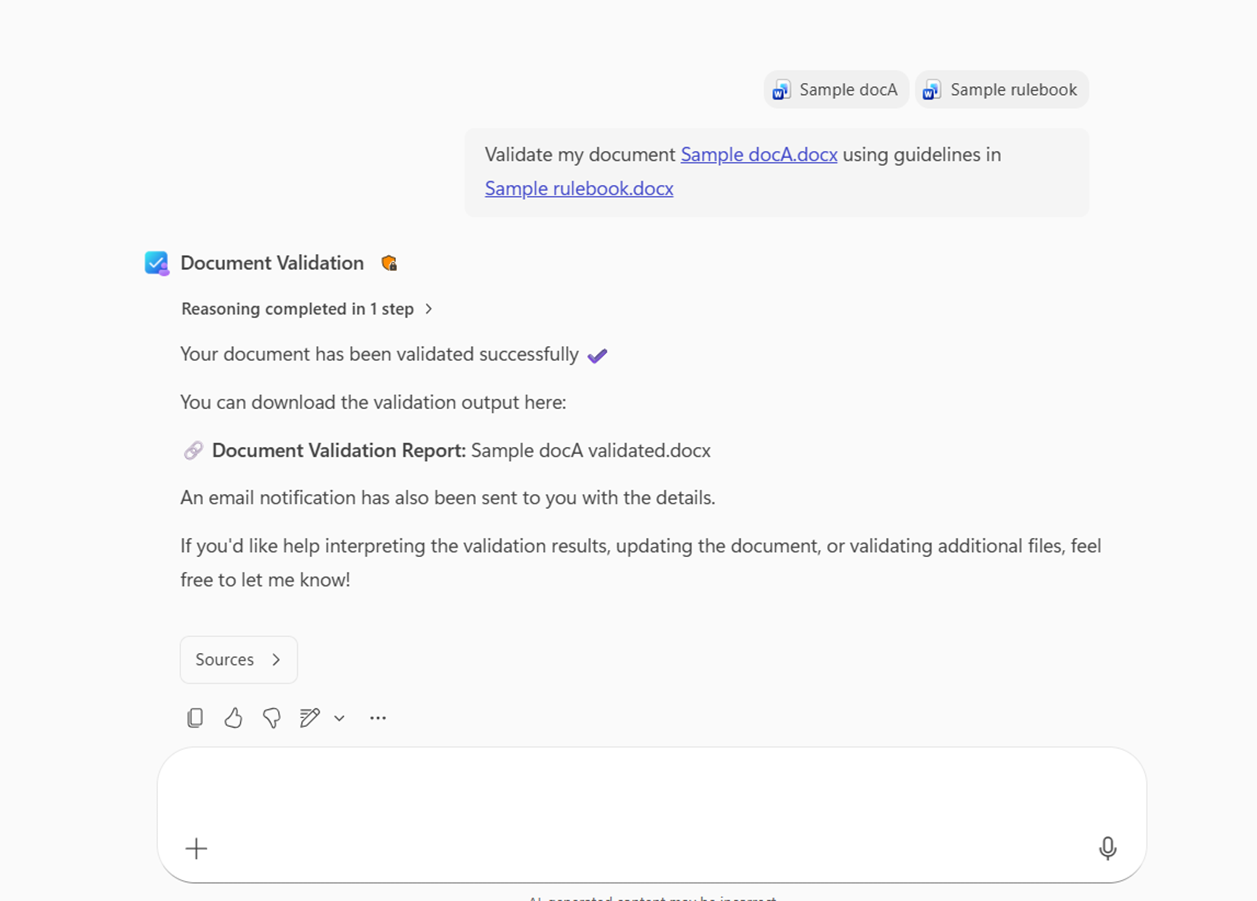 - De agent negeert en gebruikt geen rulebooks die in de chat zijn geüpload voor validatie.