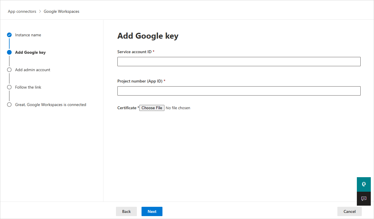 Voer een van de volgende handelingen uit om de verbindingsgegevens van Google Workspace op te geven onder App-connectors: