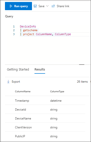 {EventType} | getschema | project ColumnName, ColumnTypeHier volgt een voorbeeld van de gebeurtenis Apparaatgegevens: