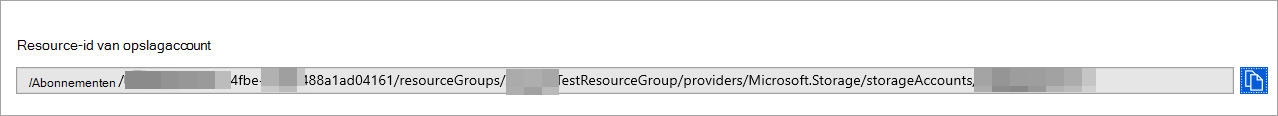 Typ de resource-id van uw opslagaccount. Als u de resource-id van uw opslagaccount wilt ophalen, gaat u naar de pagina Van uw opslagaccount op Azure Portal> tabblad > Eigenschappen kopieert u de tekst onder Resource-id opslagaccount:
