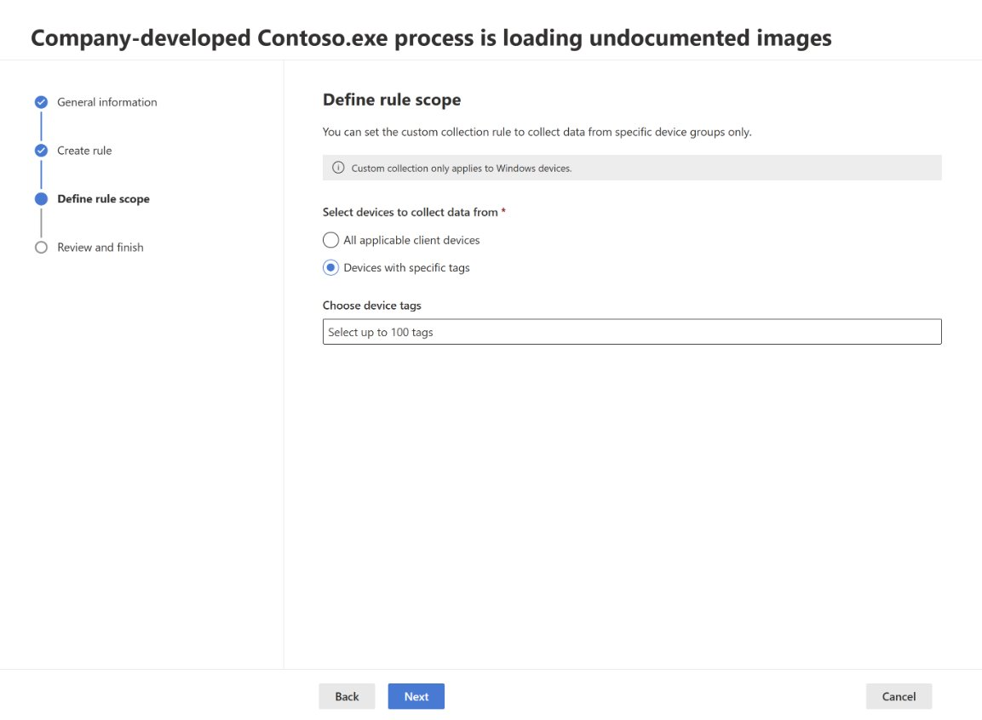 7. Selecteer in de sectie Regelbereik definiëren of u gegevens wilt verzamelen van alle toepasselijke clientapparaten of van specifieke apparaten met dynamische tags. Zie Dynamische regels maken voor apparaten in assetregelbeheer voor meer informatie.