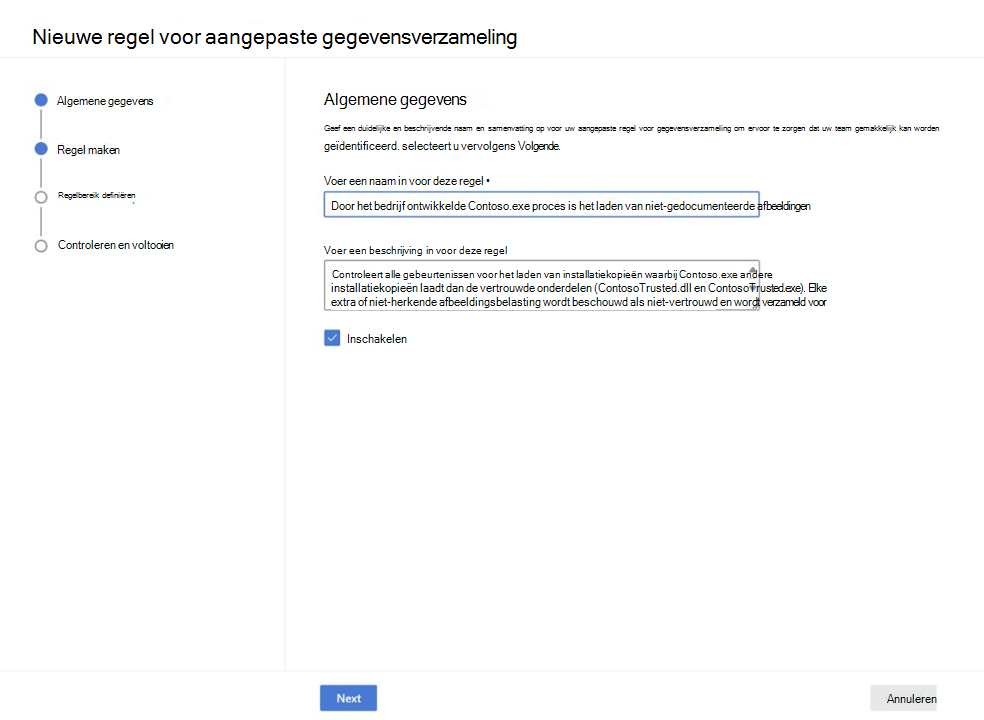 4. Selecteer Regel maken. Typ in de sectie Algemene informatie een regelnaam en beschrijving en selecteer Volgende.