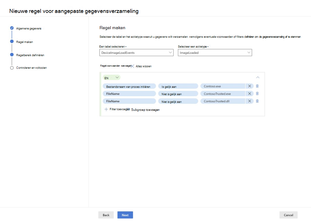 Met aangepaste regels voor gegevensverzameling kunt u specifieke gebeurtenissen definiëren en de gegevens analyseren om uw beveiligingszichtbaarheid en opsporingsbewerkingen voor bedreigingen te verbeteren. Aangepaste regels voor gegevensverzameling zijn gebaseerd op aangepaste filters voor gebeurteniseigenschappen, zoals mappaden, procesnamen en netwerkverbindingen.