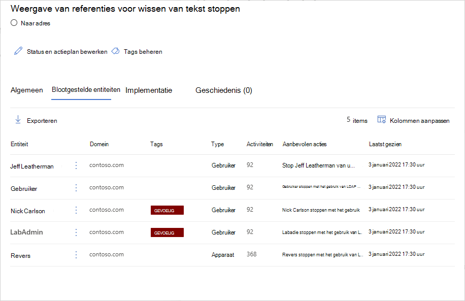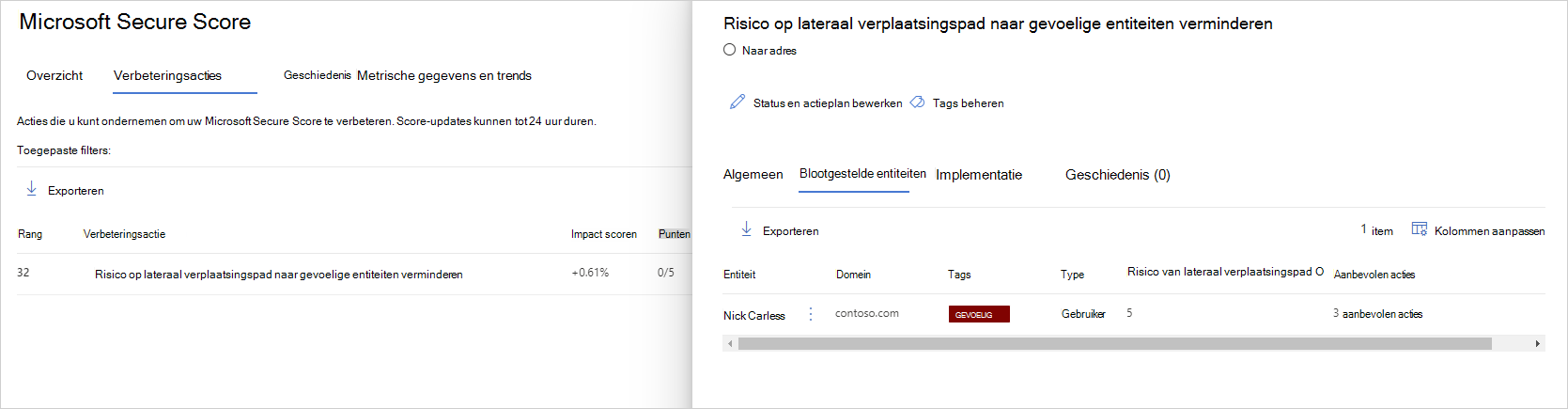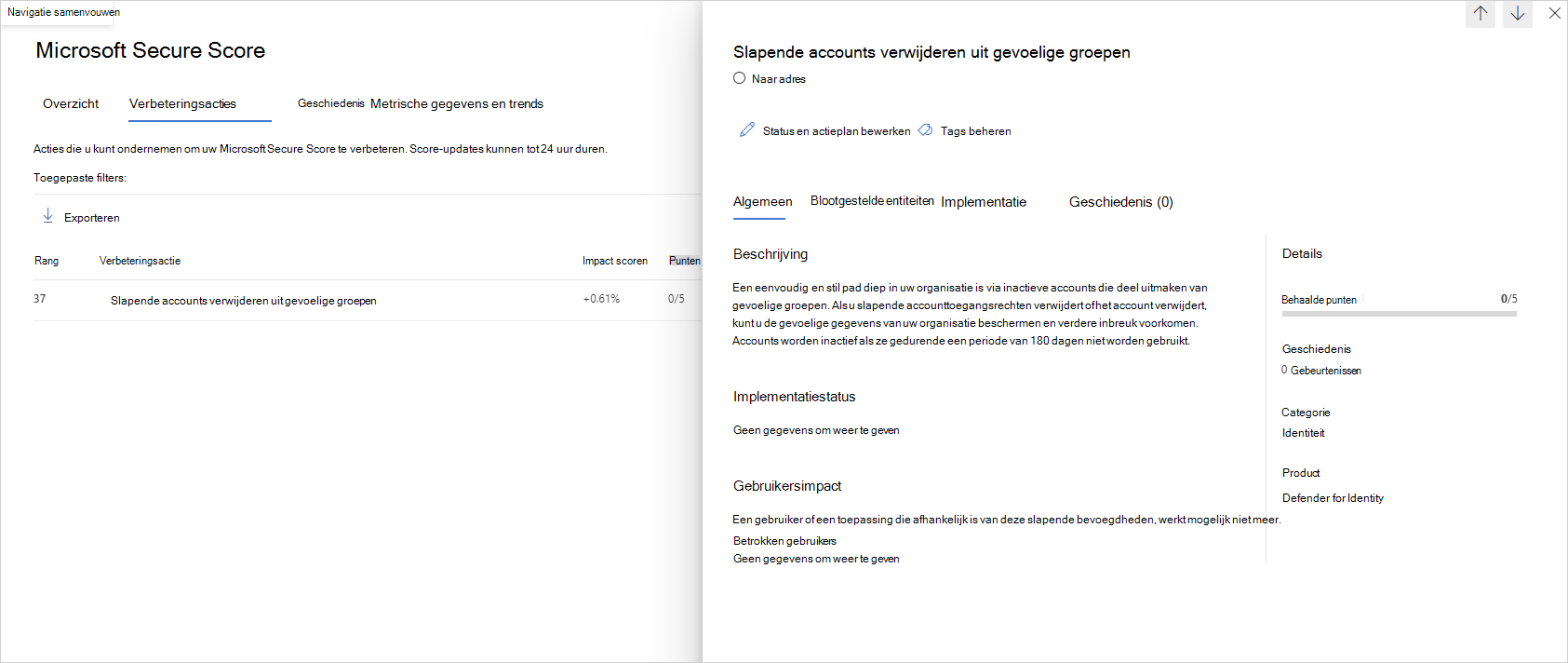 Bekijk de aanbevolen actie op https://security.microsoft.com/securescore?viewid=actions om te ontdekken welke van uw gevoelige accounts inactief zijn.