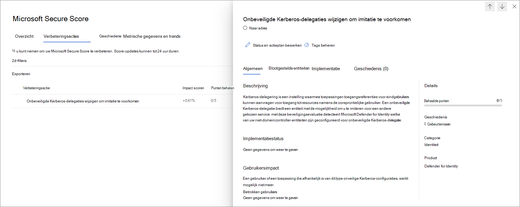 Bekijk de aanbevolen actie op https://security.microsoft.com/securescore?viewid=actions om te ontdekken welke van uw niet-domeincontroller-entiteiten zijn geconfigureerd voor onbeveiligde Kerberos-delegering.