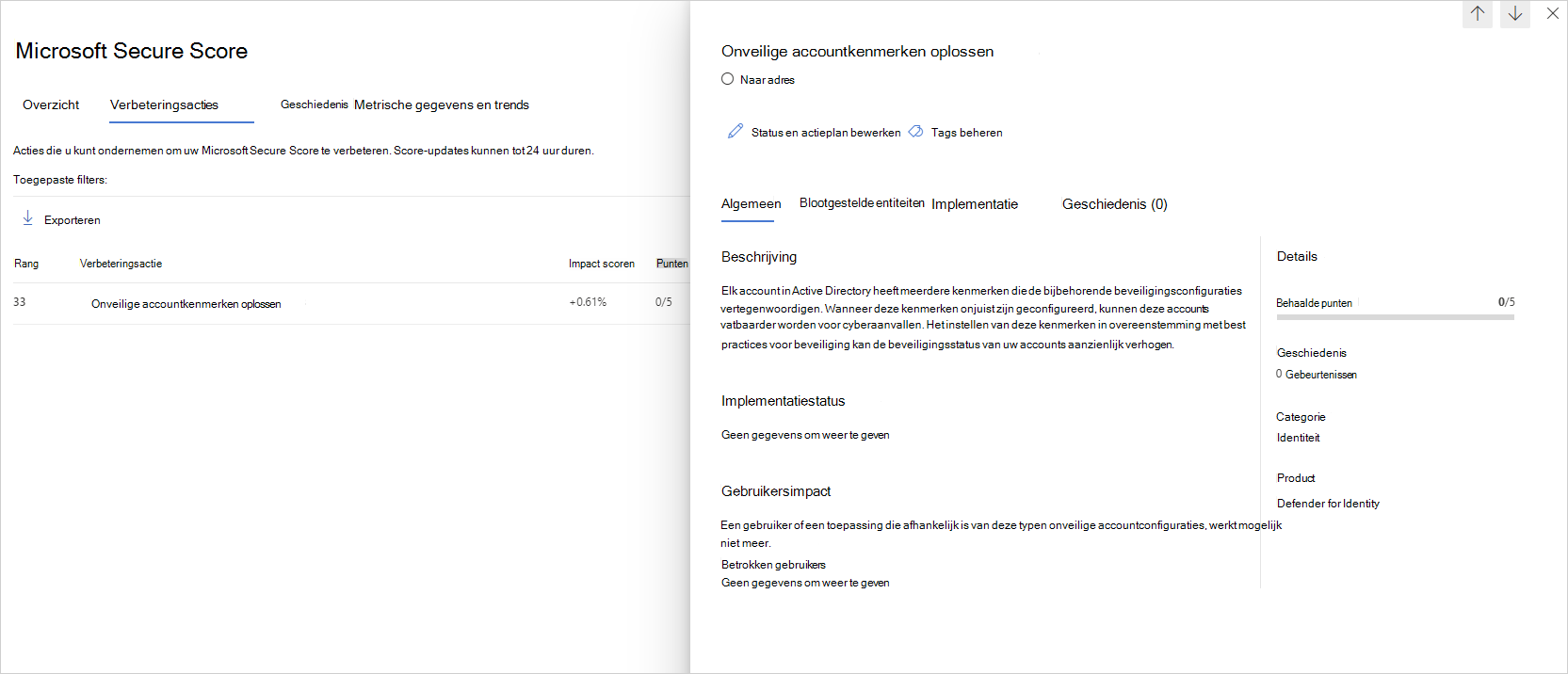Bekijk de aanbevolen actie op https://security.microsoft.com/securescore?viewid=actions om te ontdekken welke van uw accounts niet-beveiligde kenmerken hebben.