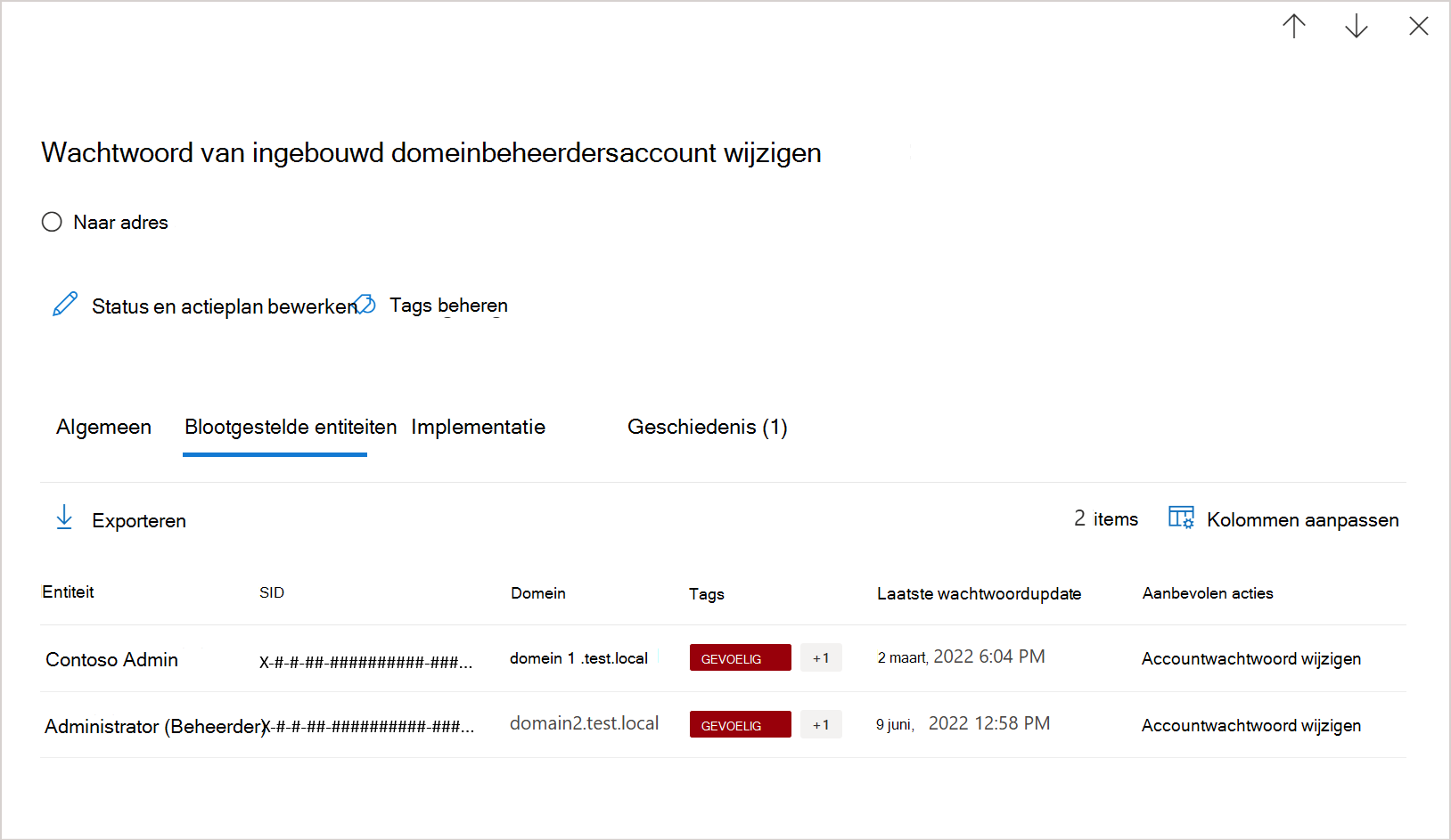 In deze aanbeveling worden alle ingebouwde domeinbeheerdersaccounts in uw omgeving vermeld met het wachtwoord dat meer dan 180 dagen geleden voor het laatst is ingesteld.