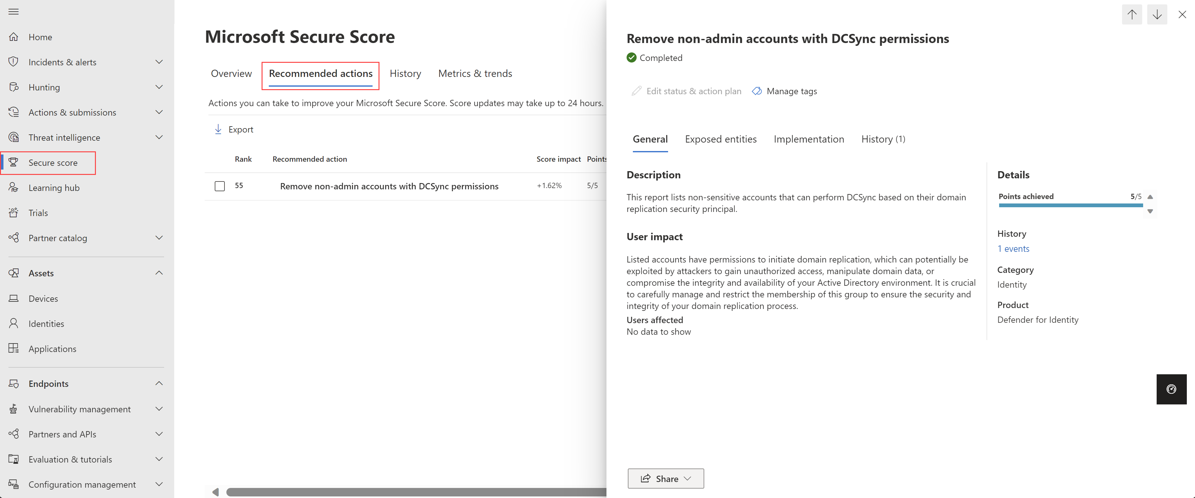Bekijk de aanbevolen actie op https://security.microsoft.com/securescore?viewid=actionsvoor Niet-beheerdersaccounts verwijderen met DCSync-machtigingen.