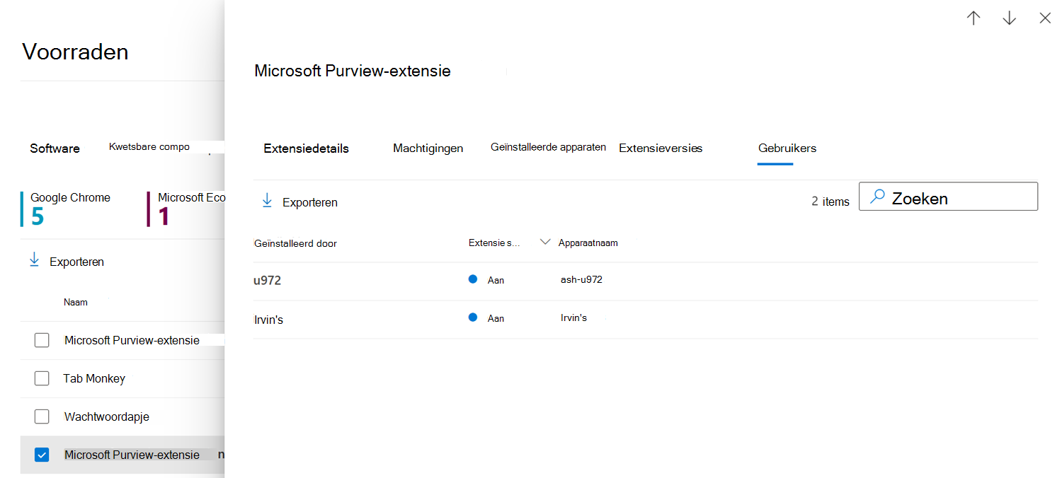 Hier kunt u zoeken naar een bepaald apparaat waarop de extensie is geïnstalleerd en kunt u een lijst met de apparaten exporteren naar een CSV-bestand.