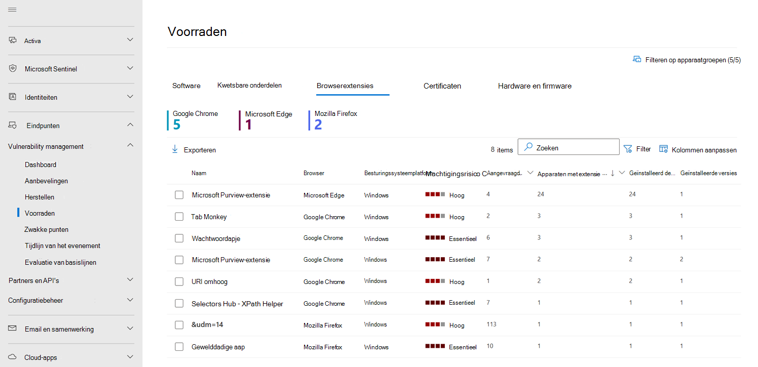 Deze browserextensie is een kleine softwaretoepassing die functionaliteit aan een webbrowser toevoegt voor gebruik met Microsoft Defender Vulnerability Management. Deze extensie biedt uw beveiligingsteam inzicht in geïnstalleerde browserextensies om ervoor te zorgen dat extensies veilig worden gebruikt in uw organisatie.