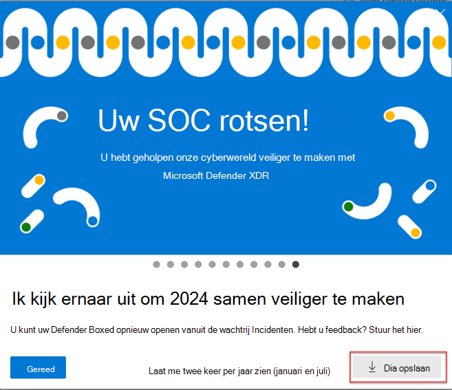 Gedurende een beperkte tijd in januari en juli van elk jaar wordt Defender Boxed automatisch weergegeven wanneer u de wachtrij voor incidenten voor het eerst opent. Defender Boxed markeert het succes, de verbeteringen en reactieacties van uw organisatie in de afgelopen zes maanden of het kalenderjaar.