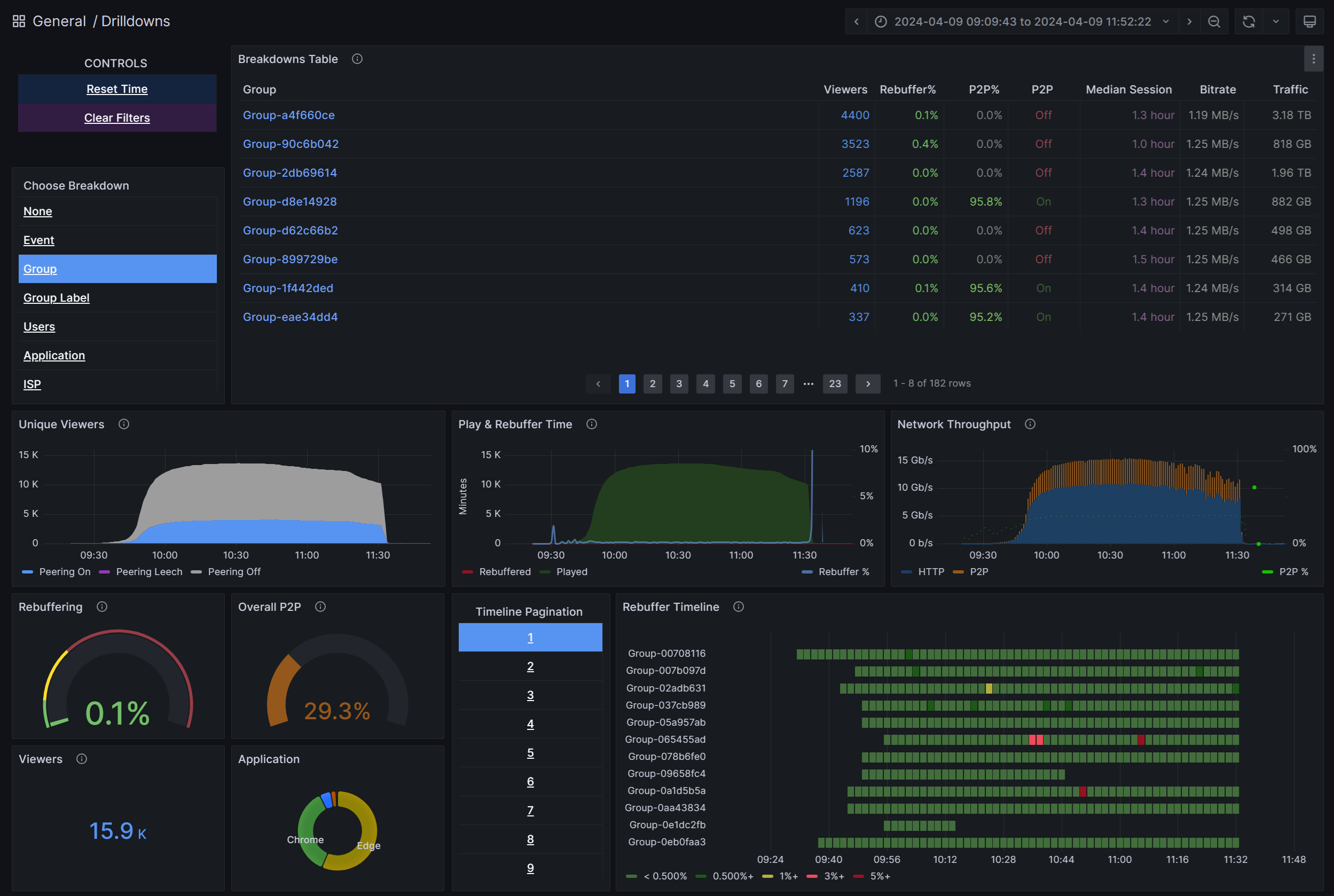 Groups - Total number of viewers and rebuffer ratio for the largest 100 groups.