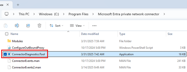 Het hulpprogramma gebruiken: Nadat u de installatie hebt gecontroleerd, kunt u het hulpprogramma vinden in de installatiemap van de connector. De standaardlocatie is C:/Program Files/Microsoft Entra Private Network Connector. Selecteer de toepassing ConnectorDiagnosticsTool om het hulpprogramma te starten.