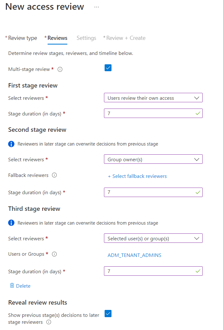 Een voorbeeld hiervan is een beoordeling die bestaat uit drie fasen die het groepslidmaatschap bepalen voor een groep die de toegang tot een resource regelt. In de controle-instellingen kiest de beheerder ervoor om geen beslissingen van eerdere revisoren weer te geven. Met deze configuratie kan elke beoordelingsdoelgroep, bijvoorbeeld de manager van de gebruiker, de groepseigenaar en een beveiligingsmedewerker, onafhankelijk van elkaar de toegang controleren. De drie fasen zijn afgestemd op de toenemende belangrijkheid van het gewicht van het publiek van de beoordelaars, waarbij beslissingen van de laatste groep beoordelaars mogelijke beslissingen van eerdere beoordelingsfasen overschrijven.