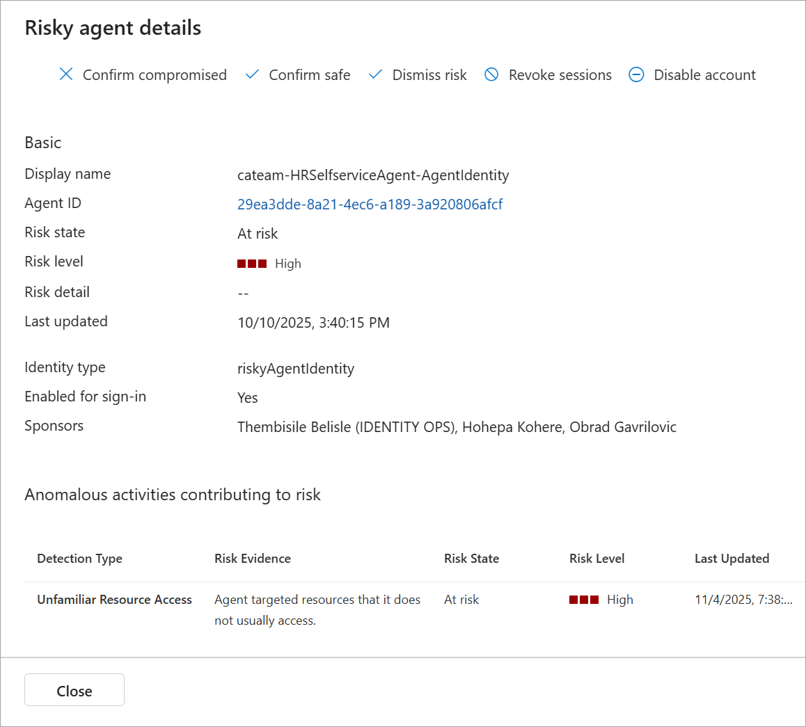 - Bevestig inbreuk: Selecteer na handmatig onderzoek of automatische detectie dat het account is gecompromitteerd. Deze stap is handig als onderdeel van incidentrespons om verdere schade te voorkomen. Bevestig dat inbreuk het risiconiveau automatisch instelt op Hoog en een gebeurtenis maakt in de risicodetecties van de agent. Met deze actie wordt beleid voor voorwaardelijke toegang op basis van risico's geactiveerd dat is geconfigureerd om de toegang tot hoog agentrisico te blokkeren.