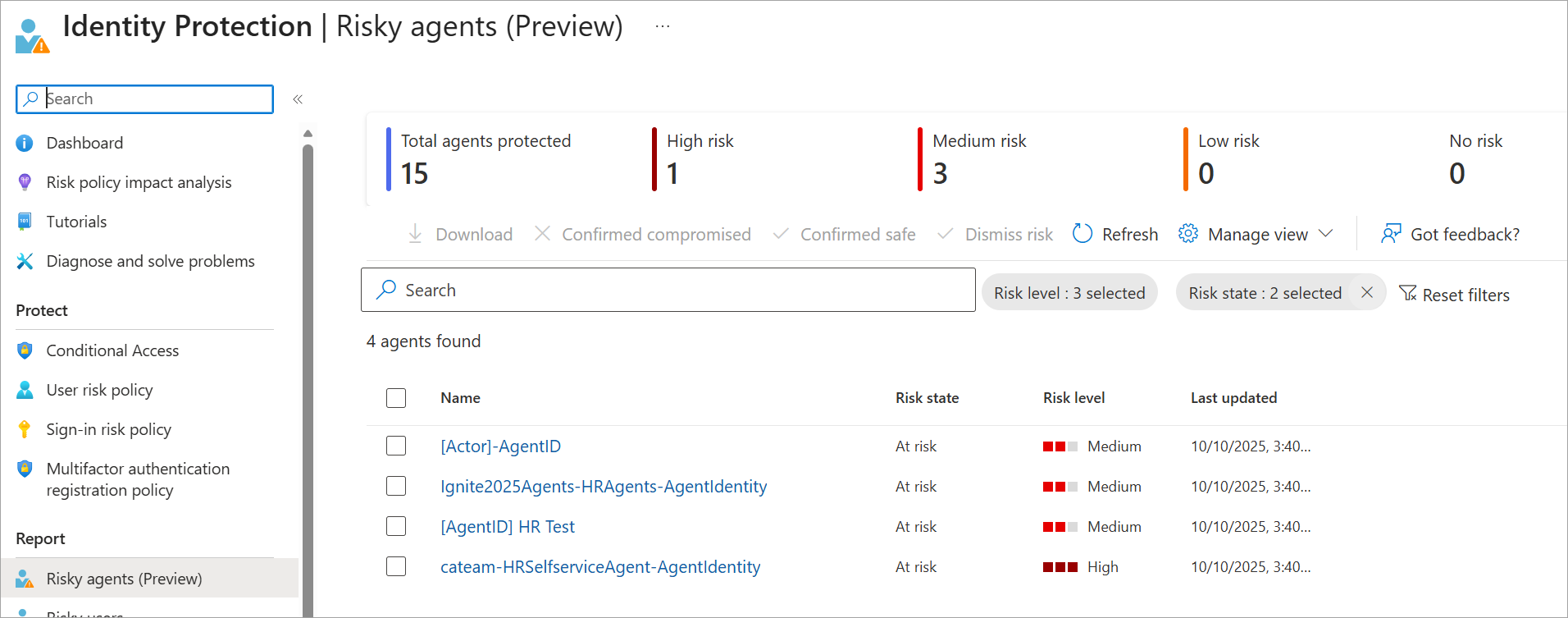 U kunt ook rechtstreeks naar het rapport Riskante agents navigeren vanuit het navigatiemenu id-beveiliging. Filter en sorteer om specifieke agents, risicostatussen of risiconiveaus te vinden.