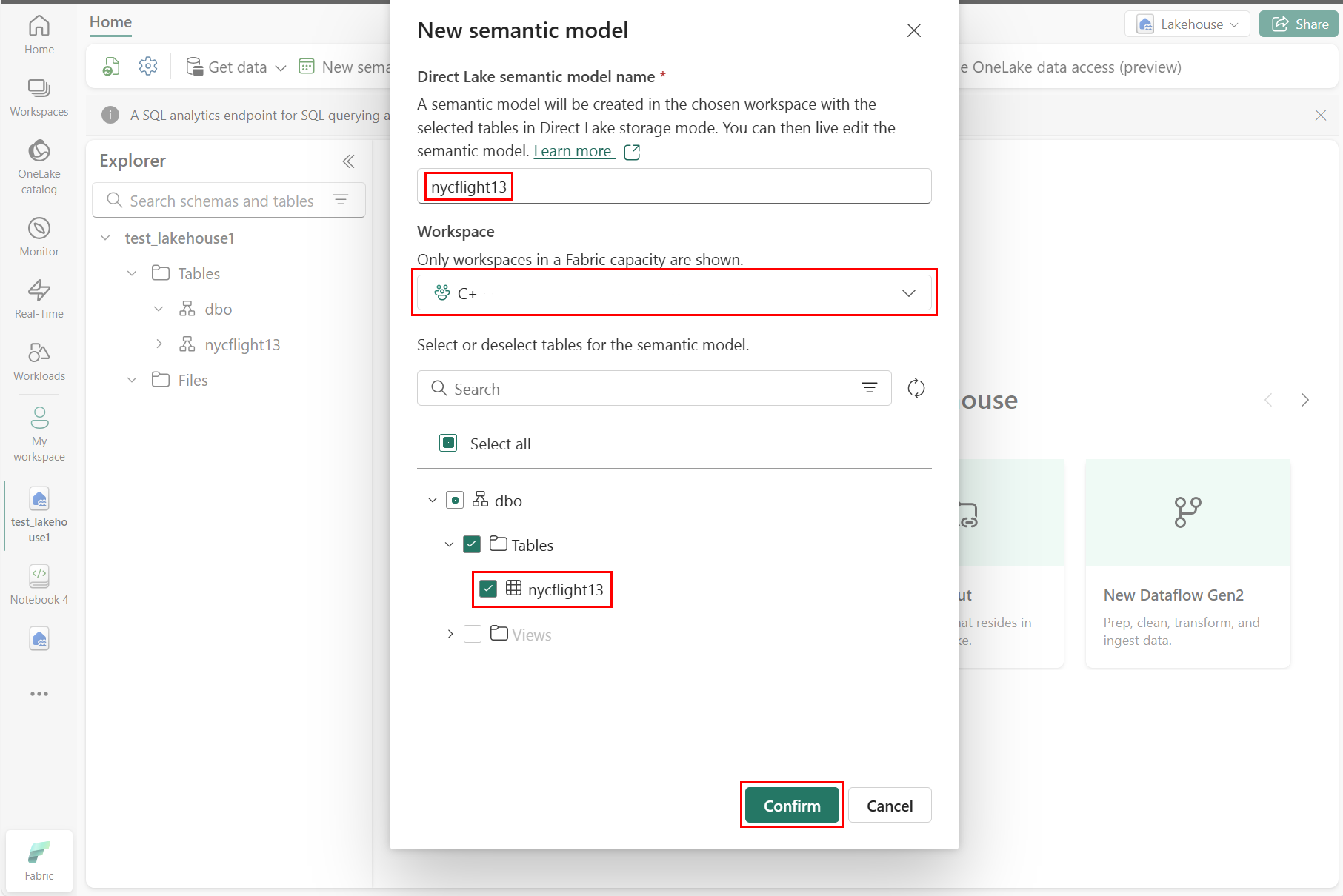 Voer in het deelvenster Nieuw semantisch model een naam in voor het nieuwe semantische model, selecteer een werkruimte en selecteer de tabellen die u voor dat nieuwe model wilt gebruiken. Selecteer vervolgens Bevestigen, zoals wordt weergegeven in de volgende schermopname: