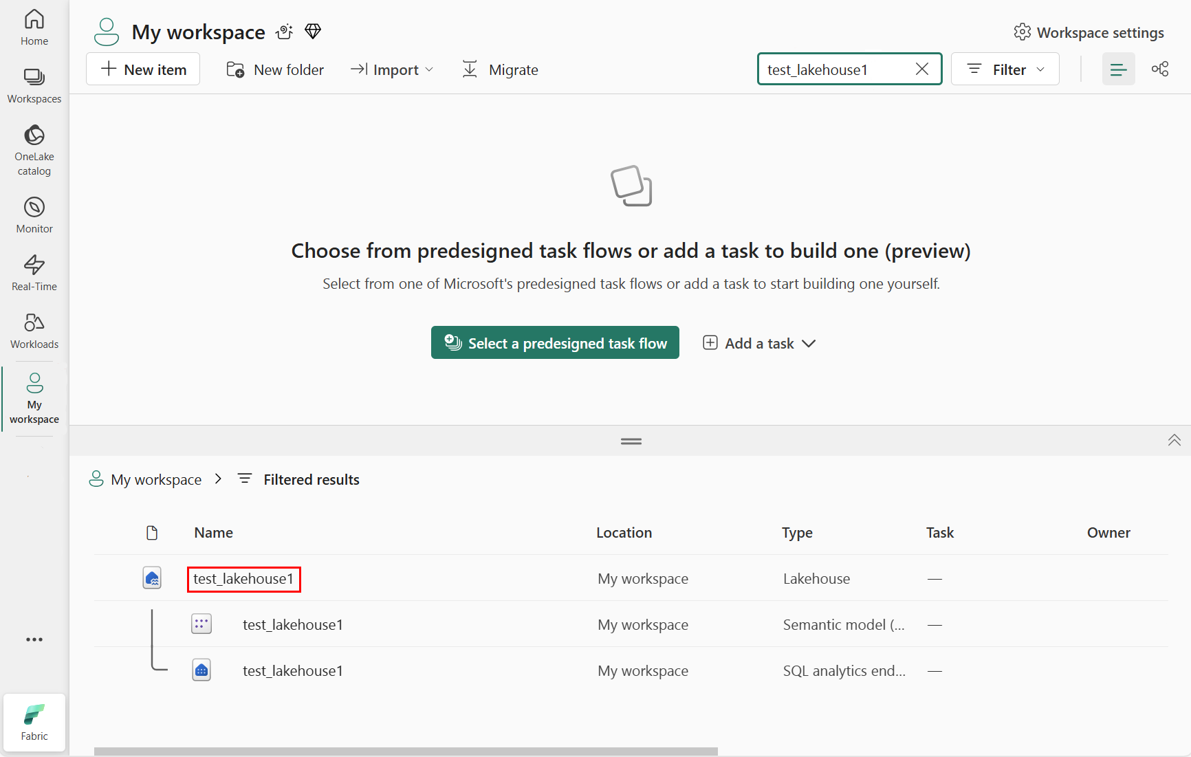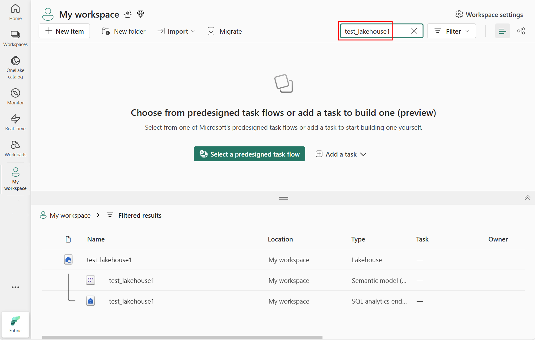 Selecteer in het gefilterde resultatengebied het lakehouse, zoals wordt weergegeven in de volgende schermopname: