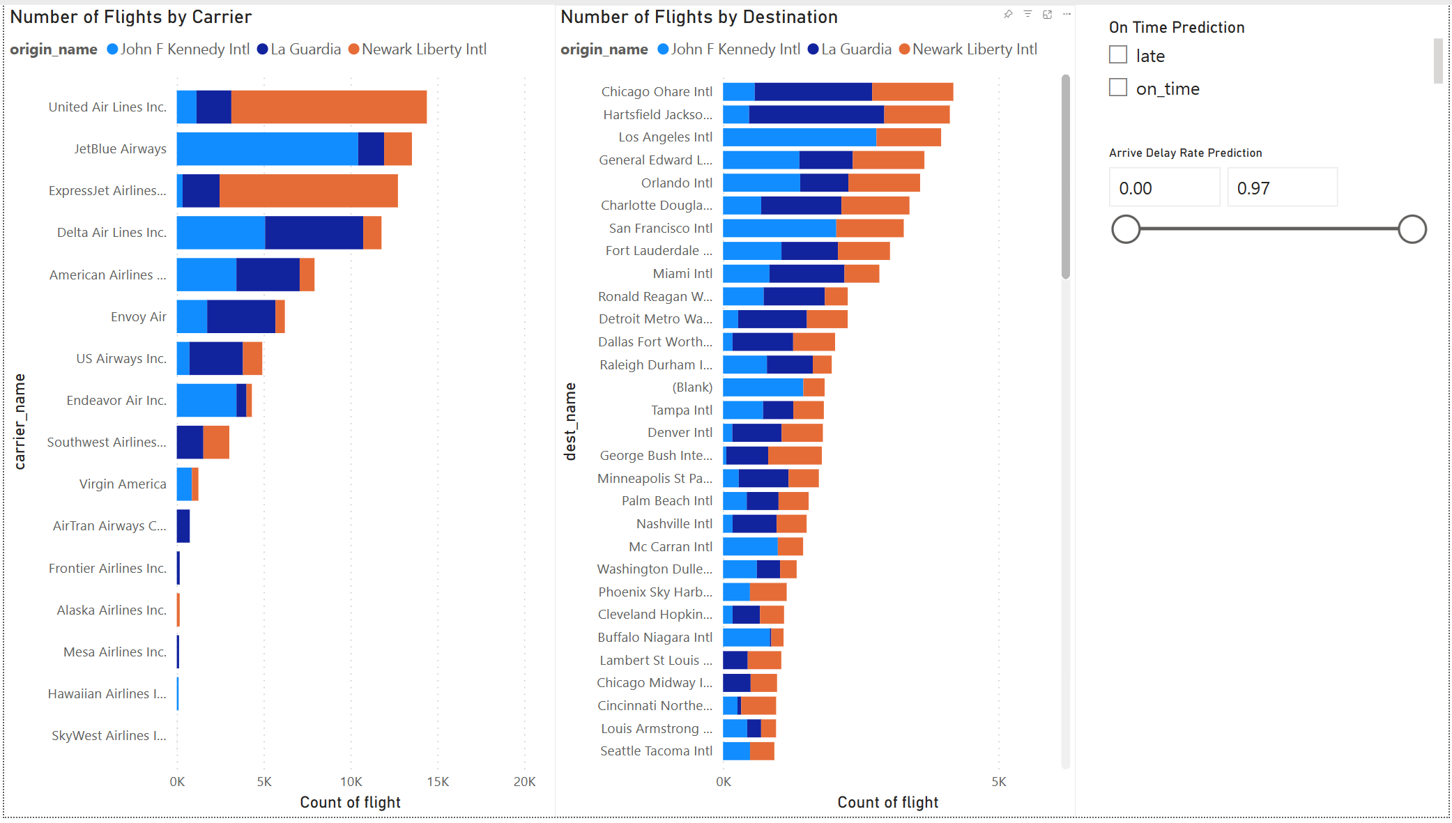 Het modelresultaat ziet er goed uit. Gebruik de voorspellingsresultaten voor vluchtvertraging om een interactief Power BI-dashboard te bouwen. Het dashboard toont het aantal vluchten per vervoerder en het aantal vluchten per bestemming. Het dashboard kan filteren op de resultaten van de vertragingsvoorspelling.