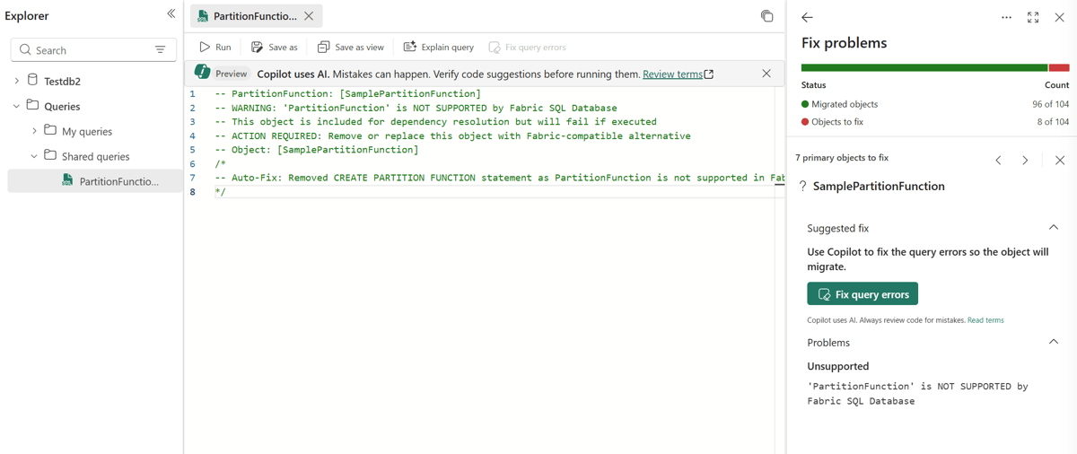 U ziet bijvoorbeeld geïdentificeerde syntaxisincompatibiliteiten en de knop Queryfouten oplossen om een oplossing of workaround voor een T-SQL-script te bieden.