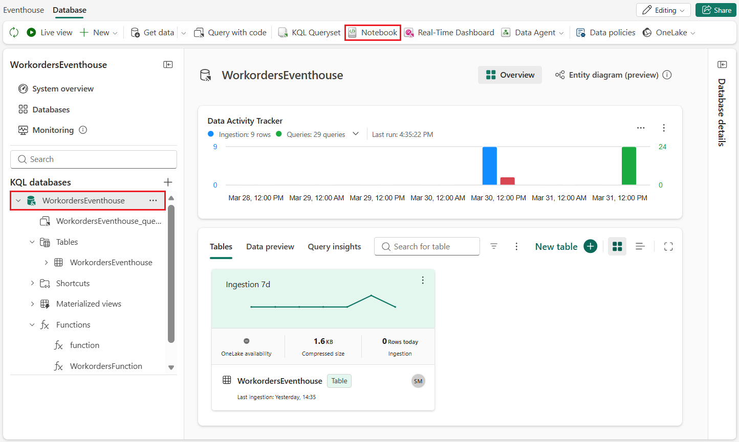 In het linkernavigatiedeelvenster onder KQL-databases, selecteer WorkordersEventhouse.