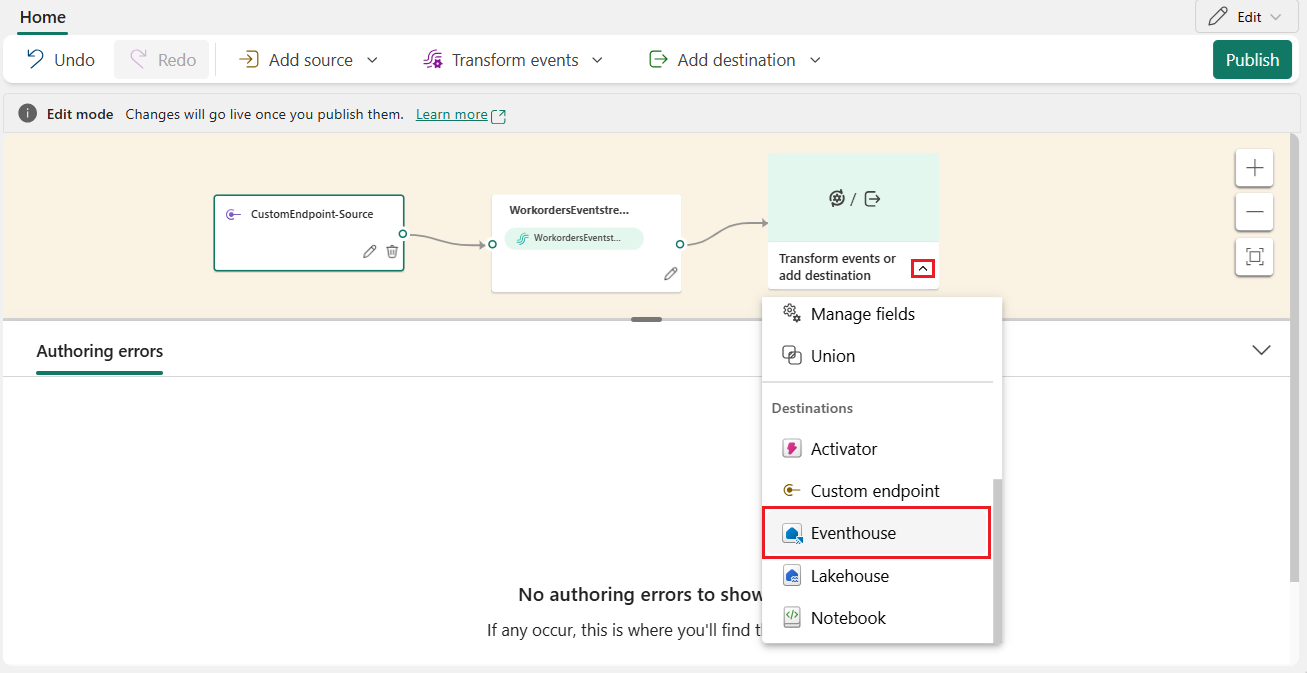 Selecteer Eventhouse in het WorkordersEventstream-knooppunt van de eventstream-ontwerper uit de vervolgkeuzelijst transformeer evenementen of voeg bestemming toe.