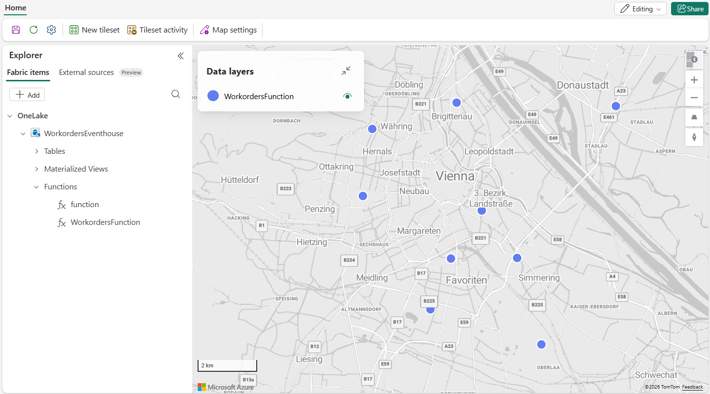 In deze sectie maakt u een Kusto-functie die de huidige locatiegegevens van de werkorder ophaalt uit de tabel Workorders in uw eventhouse en die functie vervolgens gebruikt als gegevensbron voor een Fabric Maps-kaart. Met de functie kan de kaart actieve werkorders weergeven als een laag, waardoor een visuele weergave wordt geboden van taken die moeten worden gepland en toegewezen aan veldpersoneel.