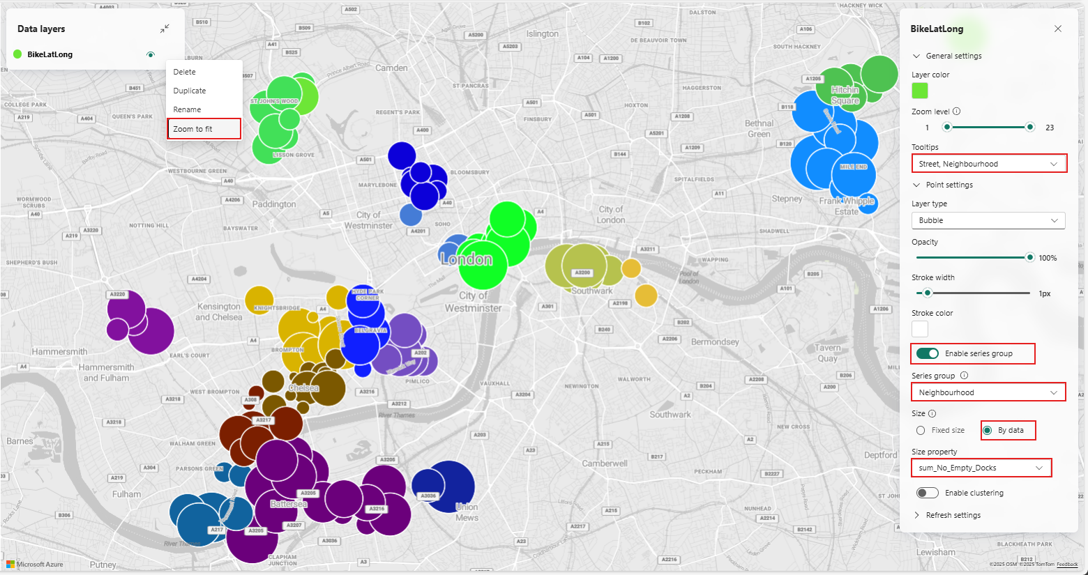Klik met de rechtermuisknop op BikeLatLong onder Gegevenslagen en selecteer Zoom om in te zoomen op het gebied van Londen met fietsstations op de kaart.