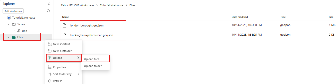 Selecteer onder TutorialLakehouse het bestand london-boroughs.geojson en klik met de rechtermuisknop op het bestand en selecteer Weergeven op kaart. Herhaal de stap voor buckingham-palace-road.json bestand.