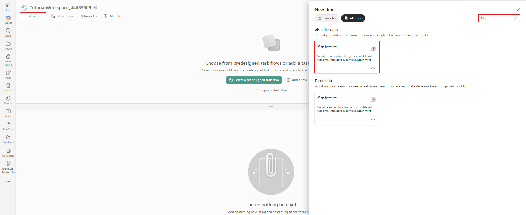 Blader naar uw werkruimte en selecteer in de linkerbovenhoek de knop + Nieuw item . Zoek en selecteer Kaart.