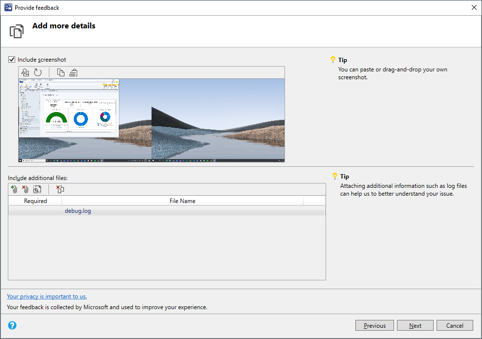 Extra bestanden toevoegen: selecteer Logboekbestanden bijvoegen en toevoegen, zodat Microsoft het probleem beter kan begrijpen. Als u alle bijgevoegde bestanden uit uw feedback wilt verwijderen, selecteert u Alles wissen. Als u afzonderlijke bestanden wilt verwijderen, selecteert u het pictogram Verwijderen rechts van de bestandsnaam.