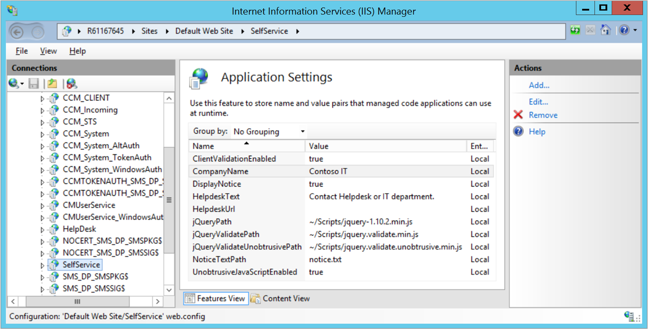 Vouw Sites uit, vouw Standaardwebsite uit en selecteer het knooppunt SelfService . Open in het detailvenster ASP.NET groep Toepassingsinstellingen.