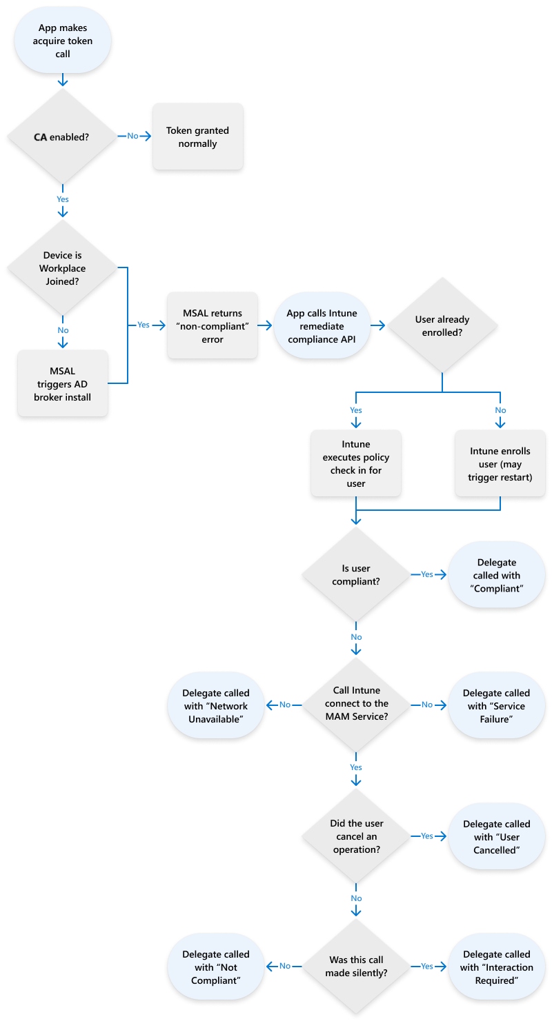 | MAM-CA altijd toegepast | Zorg ervoor dat de gebruiker is gericht op zowel app-beveiligings-CA- als MAM-beleid voordat u zich registreert bij uw app. | Controleer of uw app de hierboven beschreven herstelcases afhandelt en of de app een toegangstoken kan krijgen. |
