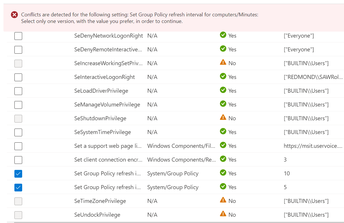 Het is mogelijk dat u meerdere groepsbeleidsobjecten hebt die dezelfde instelling bevatten en dat de instelling is ingesteld op verschillende waarden. Wanneer u een beleid maakt en uw instellingen selecteert op het tabblad Instellingen om te migreren , wordt bij conflicterende instellingen de volgende fout weergegeven:
