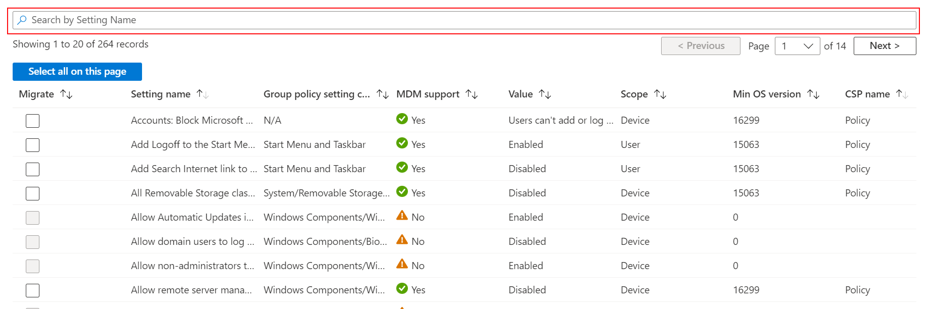 Nadat u uw GPO's hebt geïmporteerd, controleert u de instellingen die kunnen worden gemigreerd. Vergeet niet dat sommige instellingen niet logisch zijn op cloudeigen eindpunten, zoals Windows-apparaten. Nadat u deze hebt bekeken, kunt u de instellingen migreren naar het beleid Instellingencatalogus.