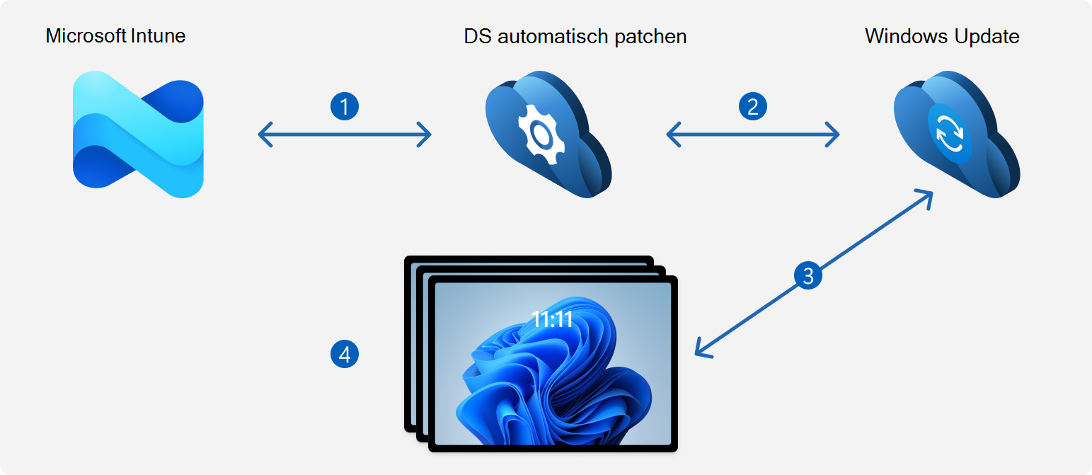 - Microsoft Intune biedt goedkeuringsgegevens voor apparaatidentiteit, toewijzing en stuurprogramma-updates. Intune verzendt beleidsinstellingen, goedgekeurde stuurprogramma's en pauzeeropdrachten naar Windows Autopatch.