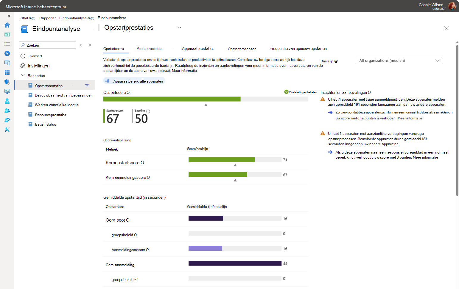 Eindpuntanalysescores variëren van 0 tot 100. Lagere scores geven aan dat er ruimte is voor verbetering. Scores helpen u te begrijpen hoe elke metrische waarde van invloed is op uw omgeving. Wanneer u bijvoorbeeld uw opstartscore bekijkt, ziet u dat uw score van 61 in totaal hoger is dan de basislijn van 50 voor alle organisaties. Wanneer u de uitsplitsing van de opstartscore bekijkt, ziet u dat uw omgeving excelleert tijdens de kernopstartfase met een score van 77. Op basis van de gemiddelde tijd die nodig is om naar een responsief bureaublad te gaan, vermoedt u echter dat langdurige opstartprocessen de aanmeldingsscore van de kern verlagen naar 46. Het controleren van de belangrijkste inzichten en aanbevelingen voor de opstartscore bevestigt dat langlopende processen verantwoordelijk zijn voor het effect op de score.