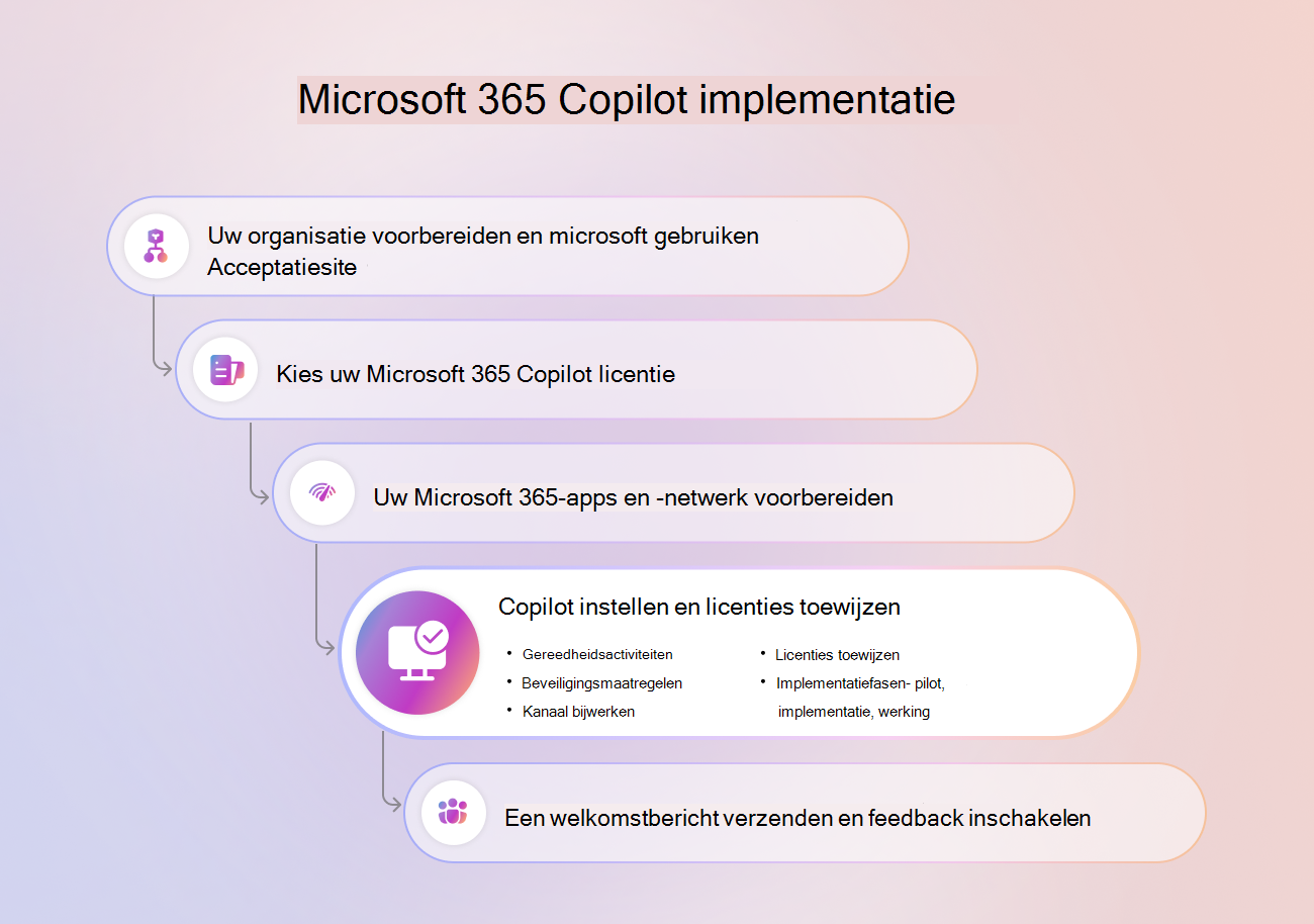 Wanneer u klaar bent om Copilot-licenties toe te wijzen aan uw gebruikers, volgt u deze drie fasen: