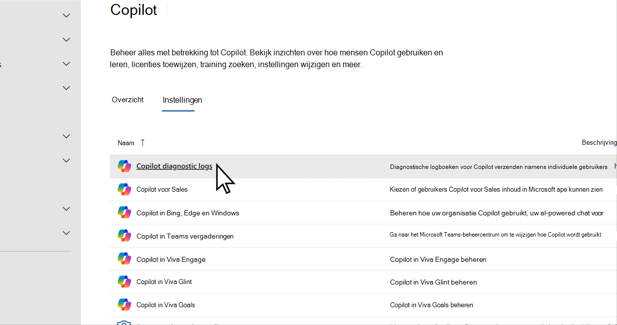 Zoek Copilot diagnostische-logboeken en selecteer deze om het deelvenster Copilot diagnostische-feedbacklogboeken te openen. Controleer de informatie en selecteer vervolgens Aan de slag.