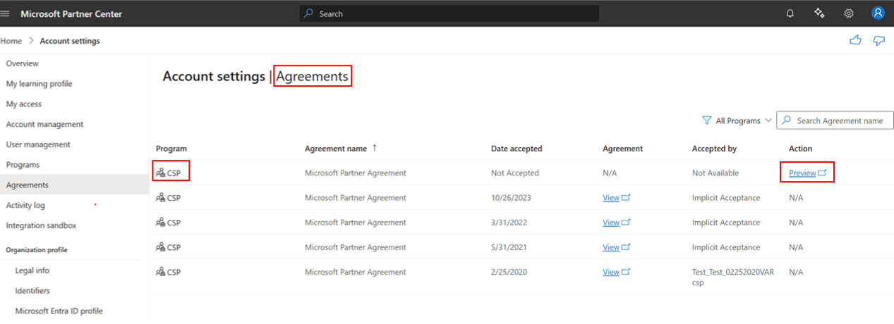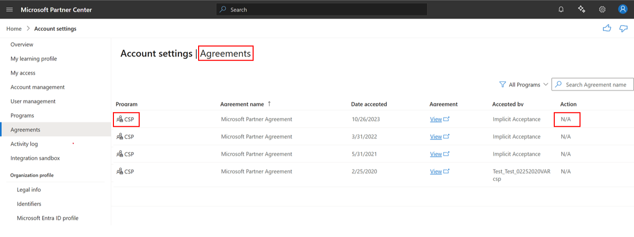 Als u eerder als CSP-partner bent overgestapt naar Partnercentrum, accepteert u de Microsoft Partner-overeenkomst op de pagina Overeenkomsten met behulp van globale beheerdersreferenties. U kunt bevestigen dat de Microsoft Partner-overeenkomst is ondertekend via informatie over het juridischeprofielprogramma of door te zoeken naar de Microsoft Partner-overeenkomst op de pagina Overeenkomsten .