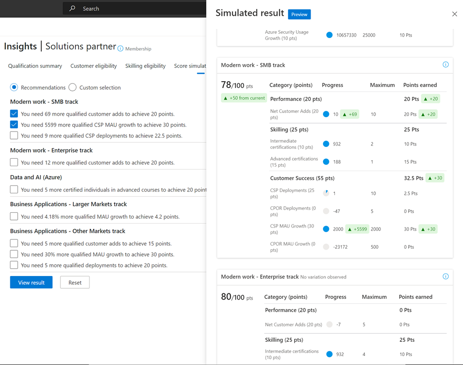 De scoresimulator beschouwt de huidige scorecard als basislijn. Op basis van invoer van partners evalueert de simulator of er gevolgen zijn voor de scores op basis van de vereisten voor oplossingsgebieden.