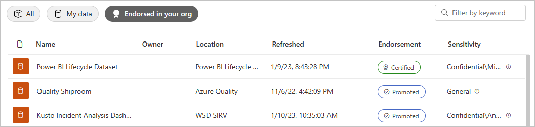 Selecteer in OneLake Data Hub de optie Goedgekeurd in uw organisatie.